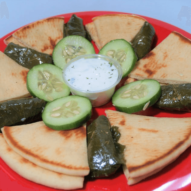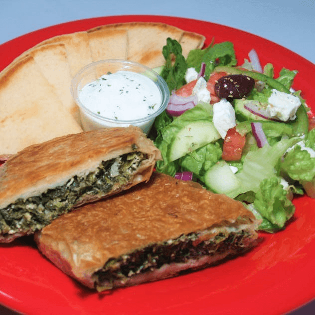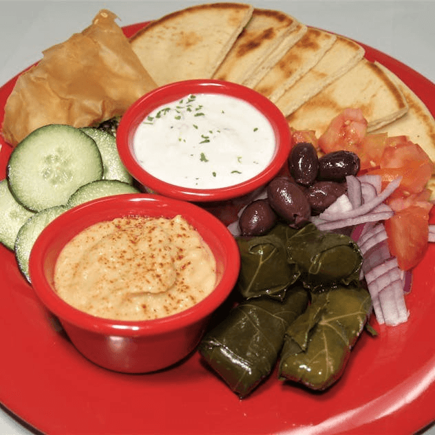 Spanakopita, Dolmades, Tzatziki, Hummus and pita.