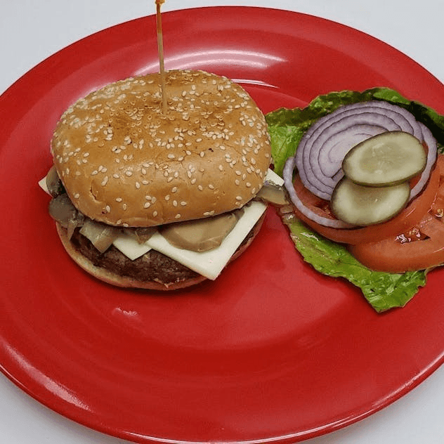 Swiss cheese mushrooms, lettuce, tomatoes and onions.