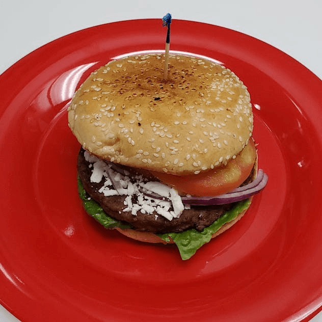Charbroiled burger topped with feta cheese.