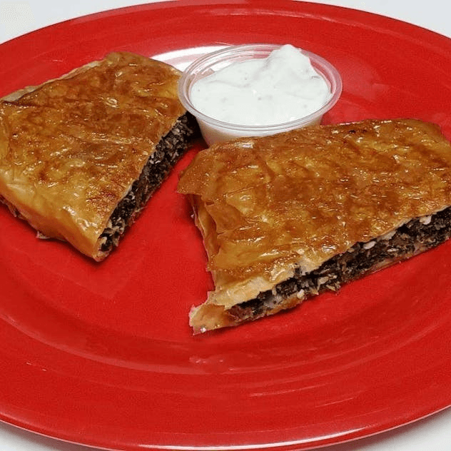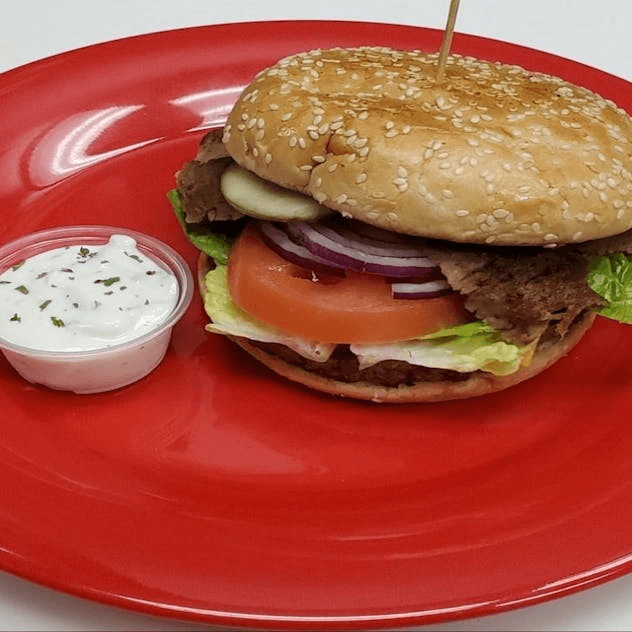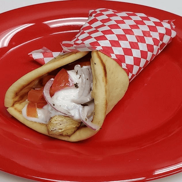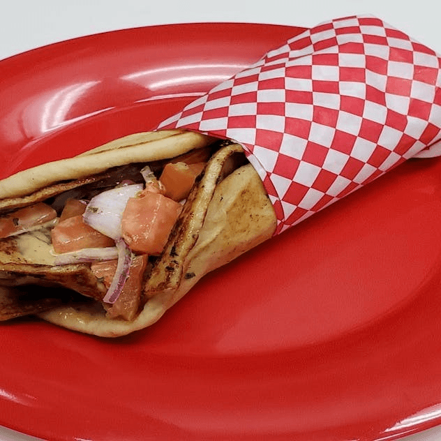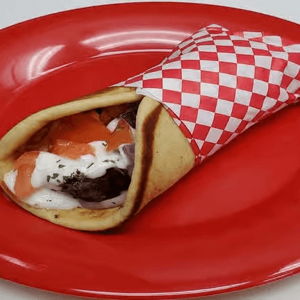 Gyro meat, tomatoes, onion and tzatziki sauce wrapped in a pita.