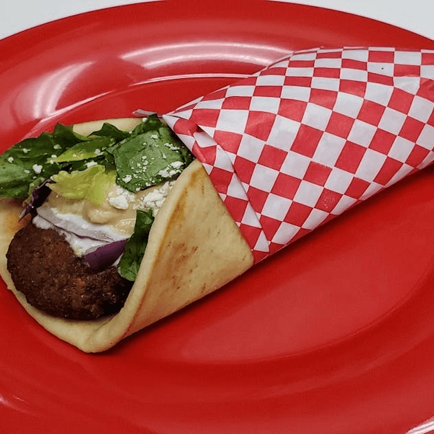 Falafel, lettuce, tomatoes, onion, feta, tzatziki sauce and hummus wrapped in pita.