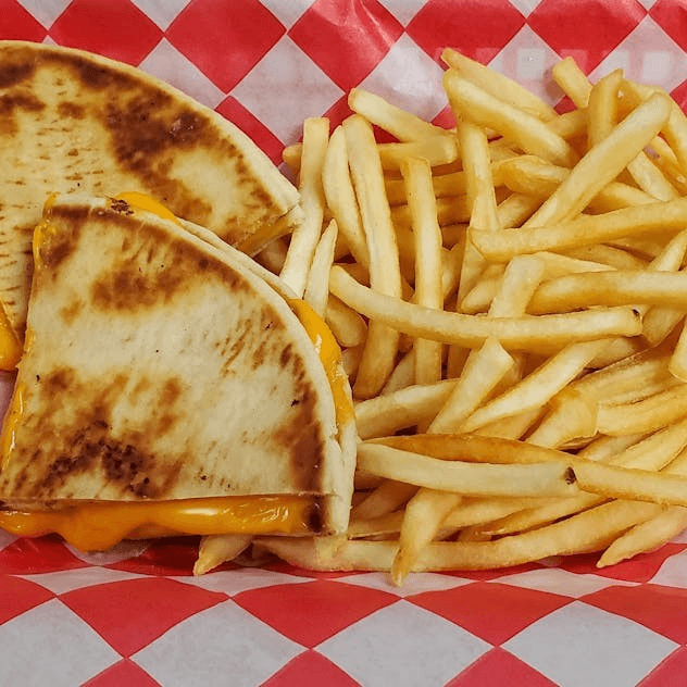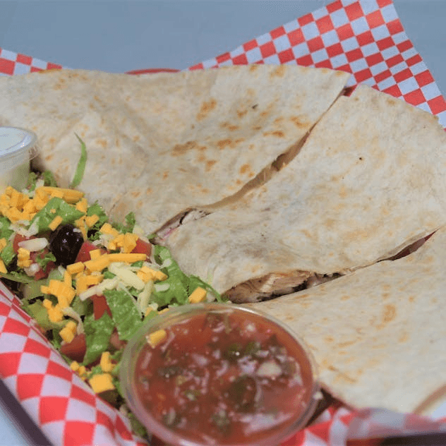 Chicken and cheese in a flour tortilla served with salsa & sour cream on the side.