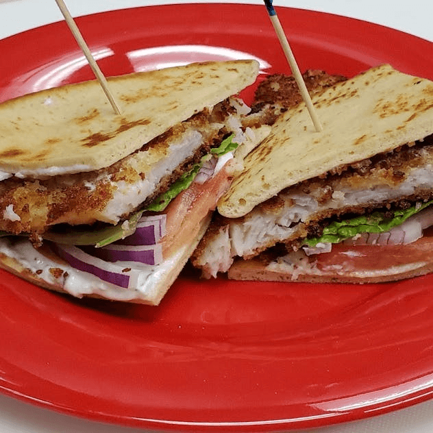 Grilled fish served on pita with tomatoes, lettuce, onions, feta cheese, and tzatziki sauce.
