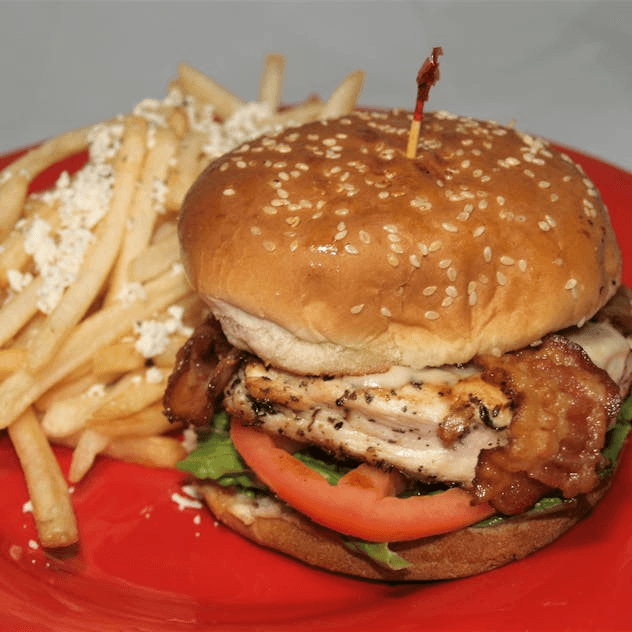 Fresh Grilled Chicken Breast topped with Swiss cheese & Bacon. Served on a toasted bun with Greek Fries & Drink
