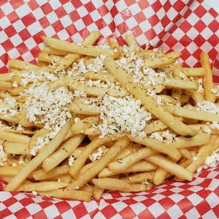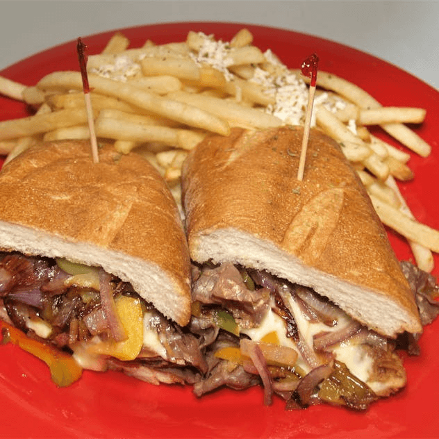 Thinly sliced beef cooked in au jus, topped with Swiss cheese, grilled onions, and peppers. Served on French bread with a side of Greek fries.