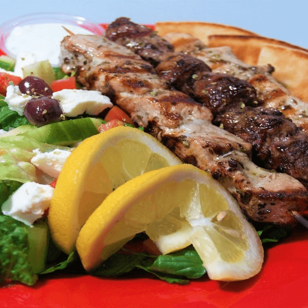 1 pork, 1 chicken, 1 lamb souvlaki, tzatziki sauce, pita and Greek salad.