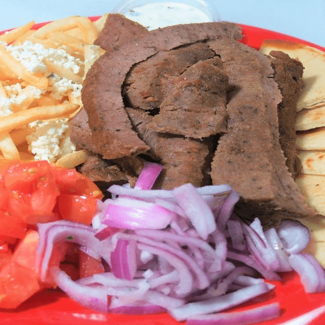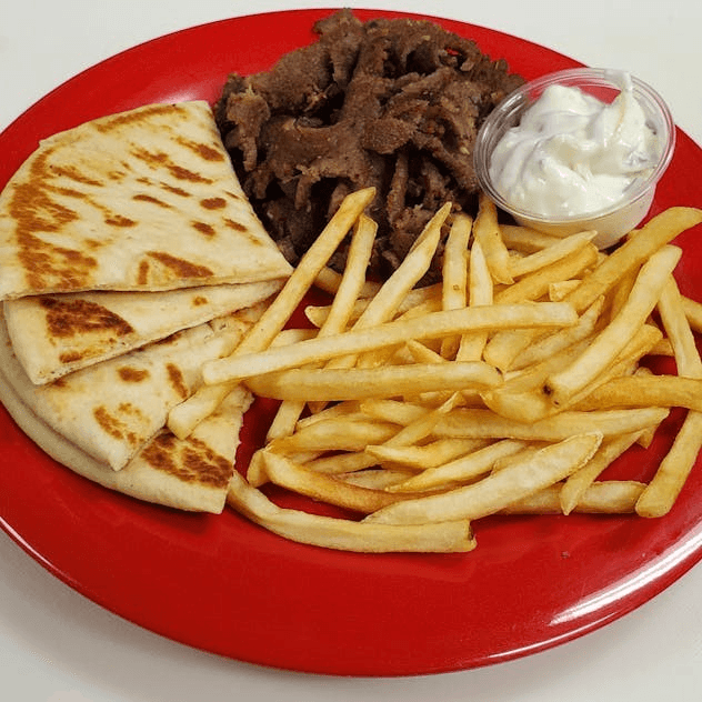 Gyro meat, greek fries, pita , tzatziki sauce