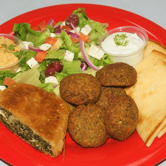 Falafel, spinach pie, Greek salad, pita bread tzatziki sauce, and hummus.