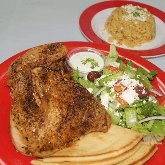 1/2 Marinated Greek Style Chicken with Greek Salad, Rice Pita, Tzatziki Sauce