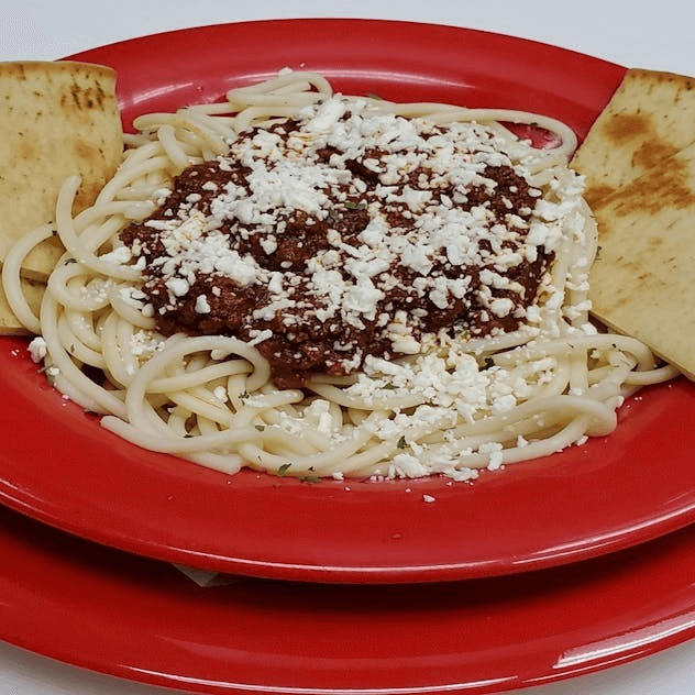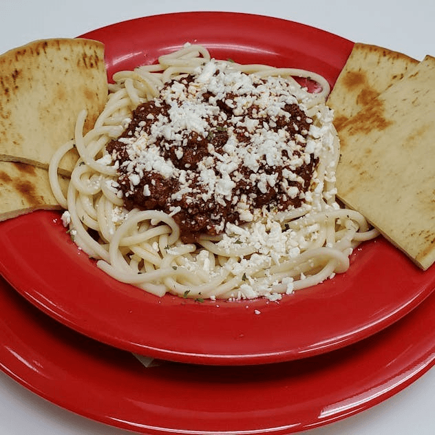 Ground beef, sauce, Greek salad and pita bread.
