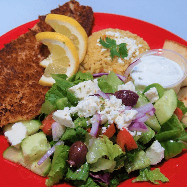 Chicken , Salad, Size of Rice, Tzatziki Sauce & Pita