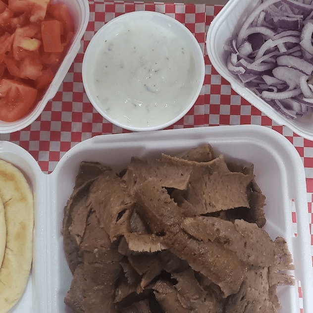 1 lbs of Gyro Meat , 8 oz tzatziki sauce, Tomatoes, and Onions.